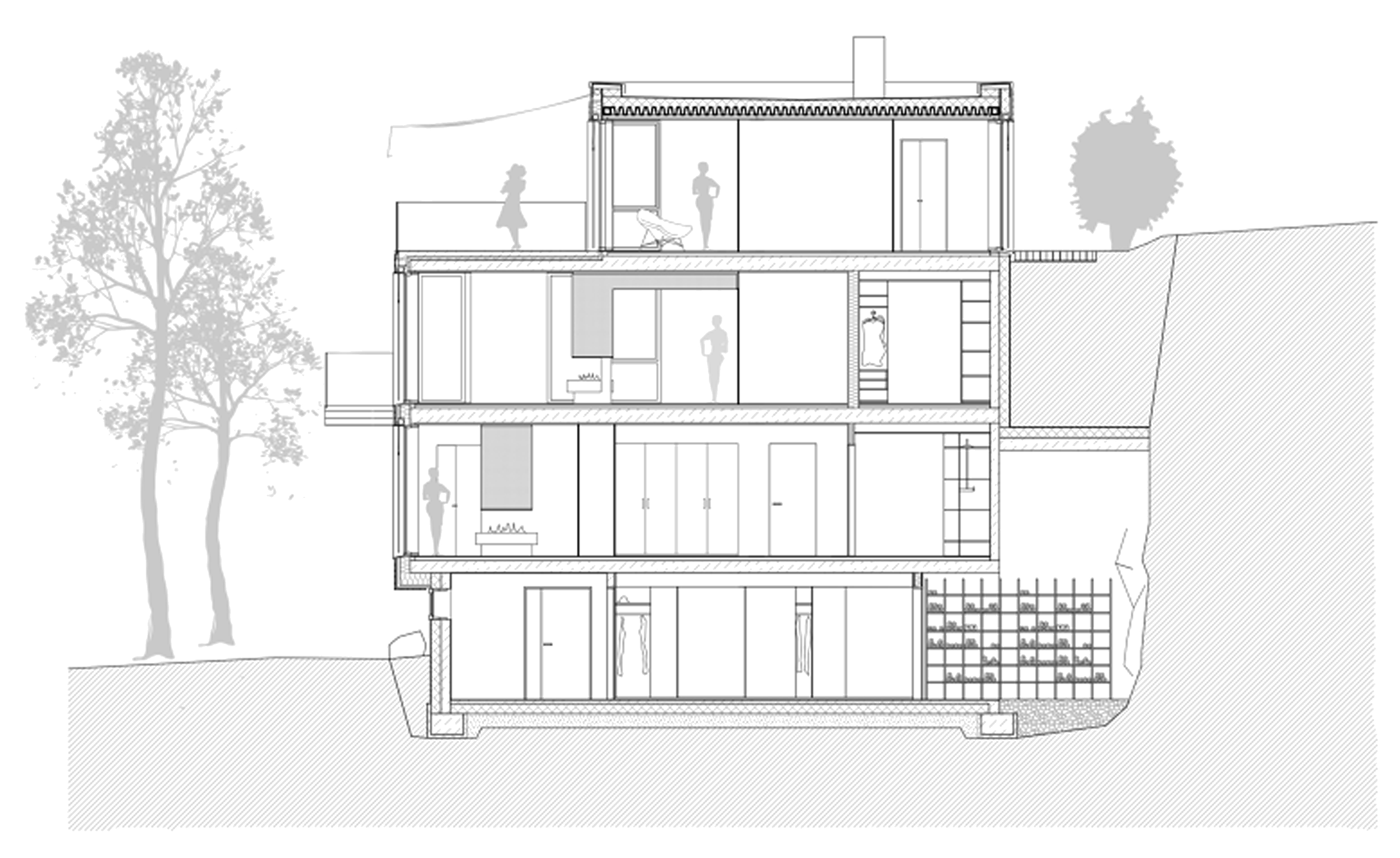 The main goal is for the house to be imbedded in the terrain, and not to jut over the Nordstrand slope, while at the same time maintaining the outdoor areas with their original distinctive qualities. Imbedding the volume of the house in the terrain also provides access to the natural terrain from all house floors in different levels.