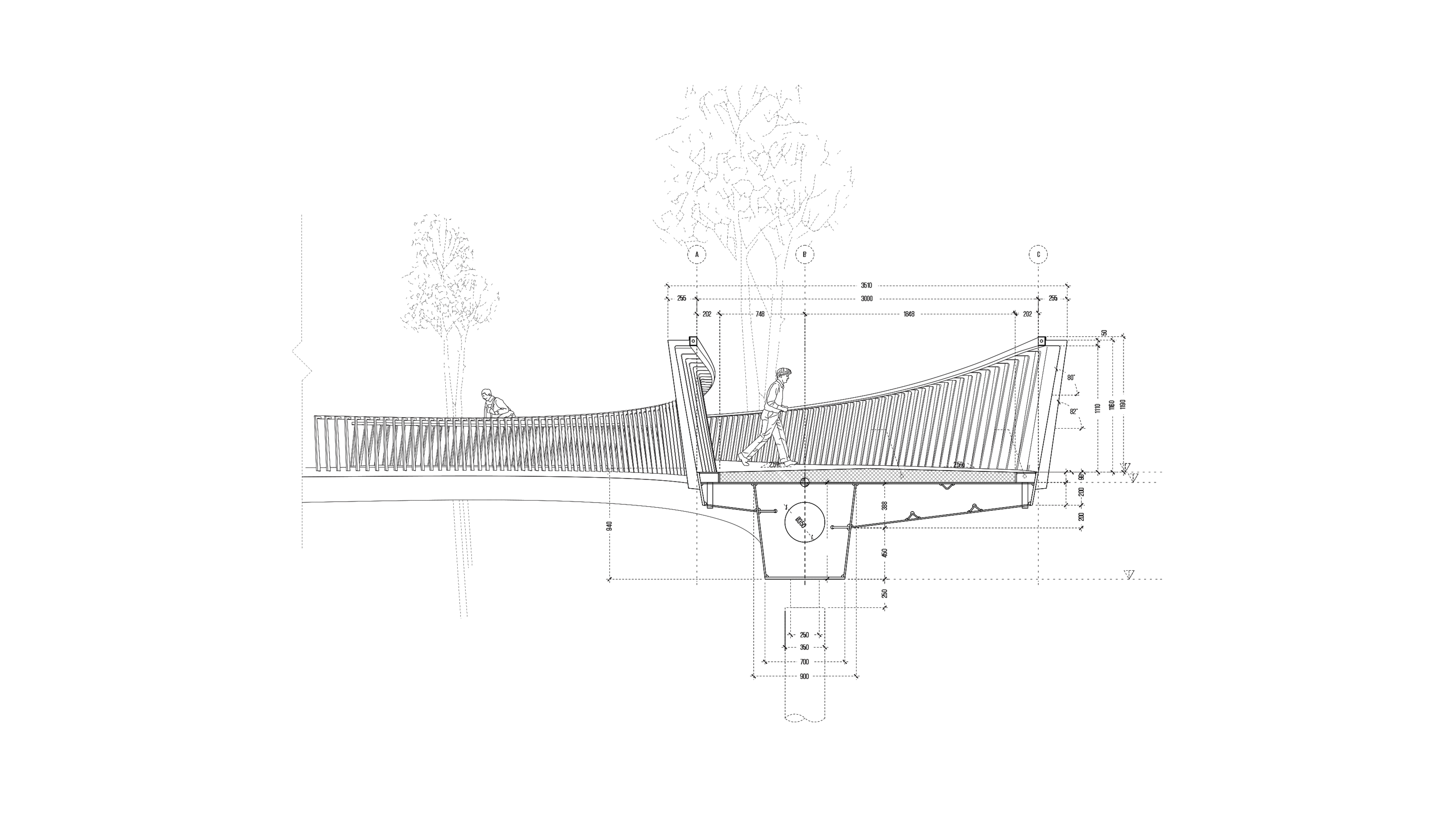 In general the free width is 3 m and the deck has a maximum slope of 1/20, in accordance with Norwegian legislation. The gradually widening up to 4 m free width in the curve creates a natural view point. Between the concrete abutments the bridge is supported by three slender columns, resembling the trunks of the large and vertical pine trees that surround the bridge. The cross section of the box girder has a trapezoidal shape with a constant depth of 850 mm and a maximum span of 22.5 m, resulting in a span to depth ratio of 1/26. To each side of the box girder closed wings cantilever out with different lengths.