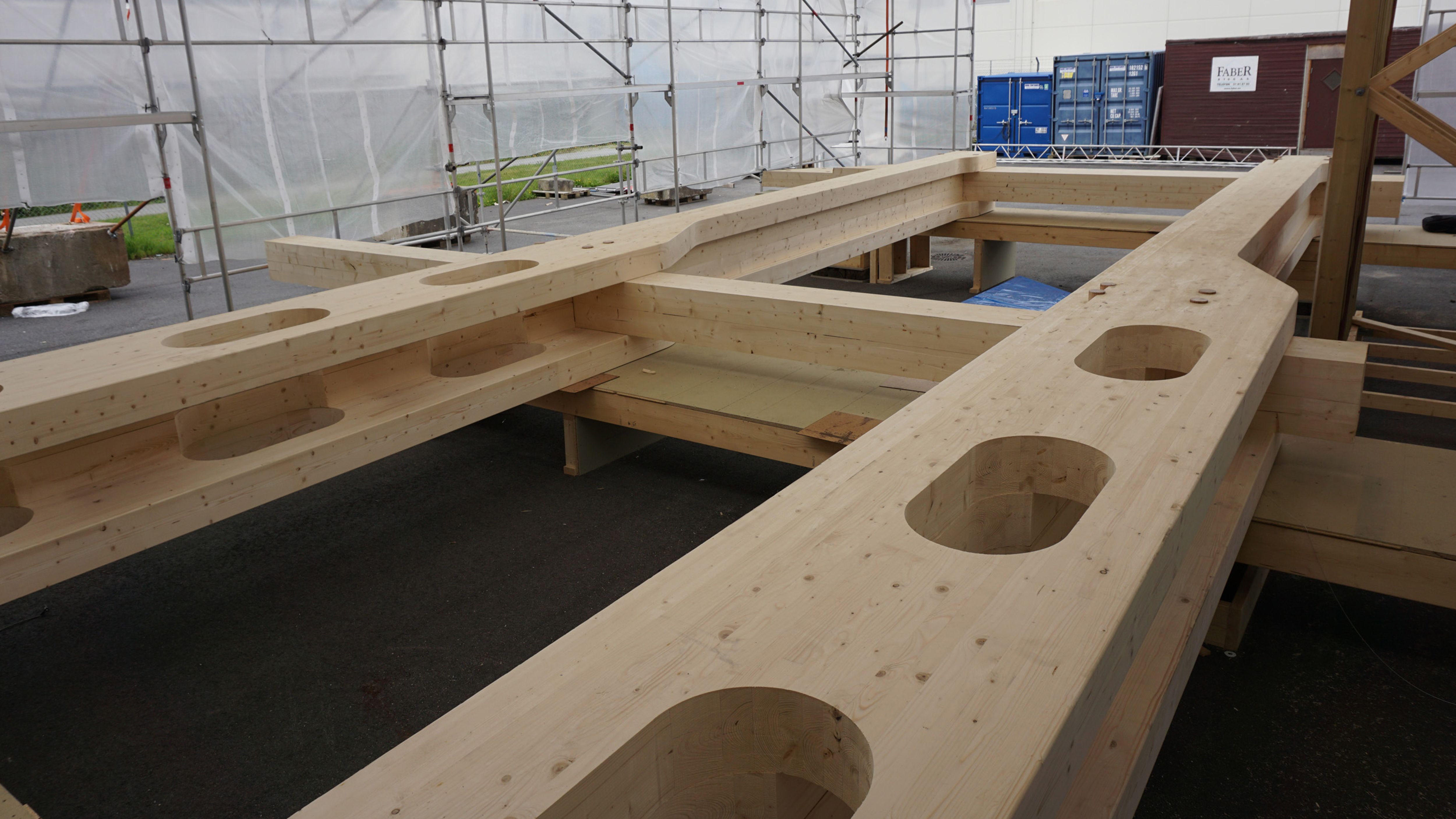 The timber structure is made stiff by visible timber joints with beech dowels and a continuous edge beam in laminated beach veneer on each floor along the façade. In the first story columns and beams are also made in laminated beach due to the cantilever over the pavement. The rest of the structure is made of Glued laminated timber and Cross-Laminated Timber in spruce.